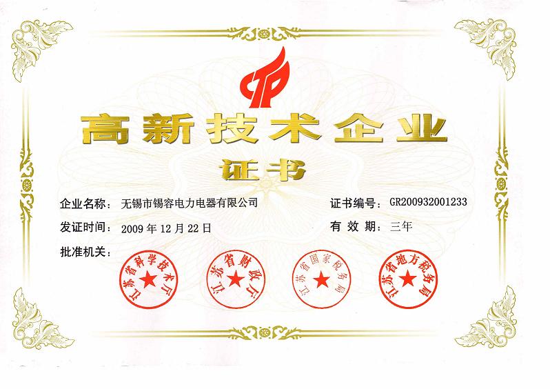 2009年12.22日,無錫市錫容電力電器有限公司獲取高新技術(shù)企業(yè)證書,批準機關(guān):江蘇省科學技術(shù)廳、江蘇省財政廳、江蘇省國家稅務(wù)局,江蘇省國家稅務(wù)局